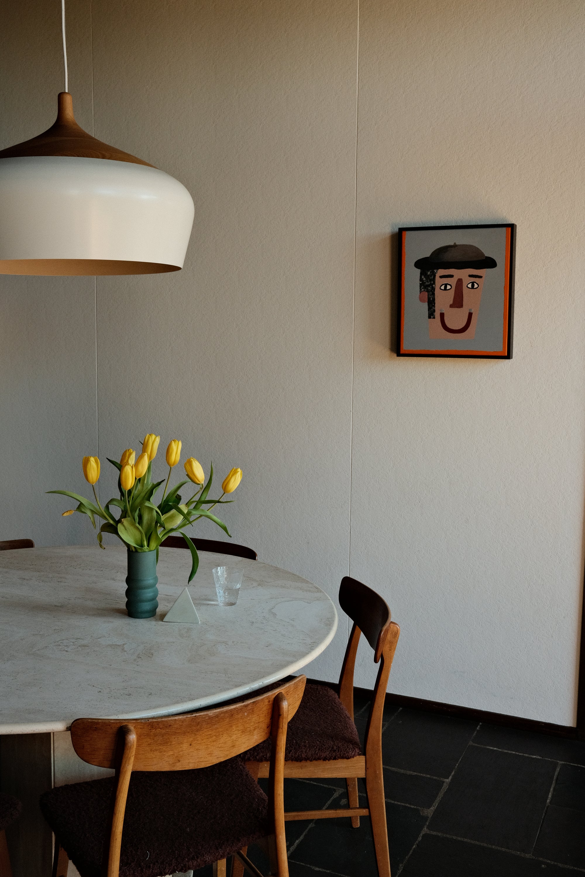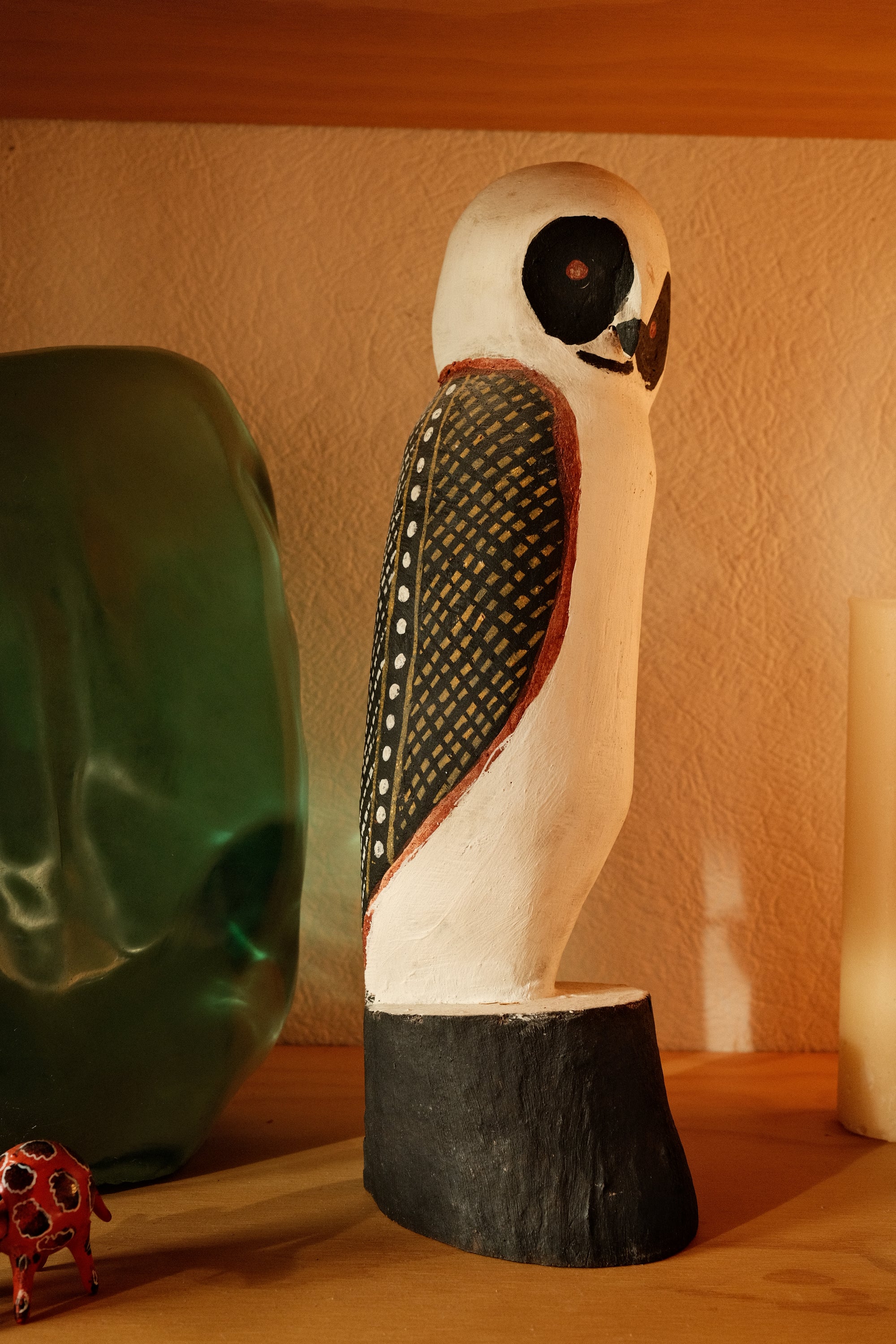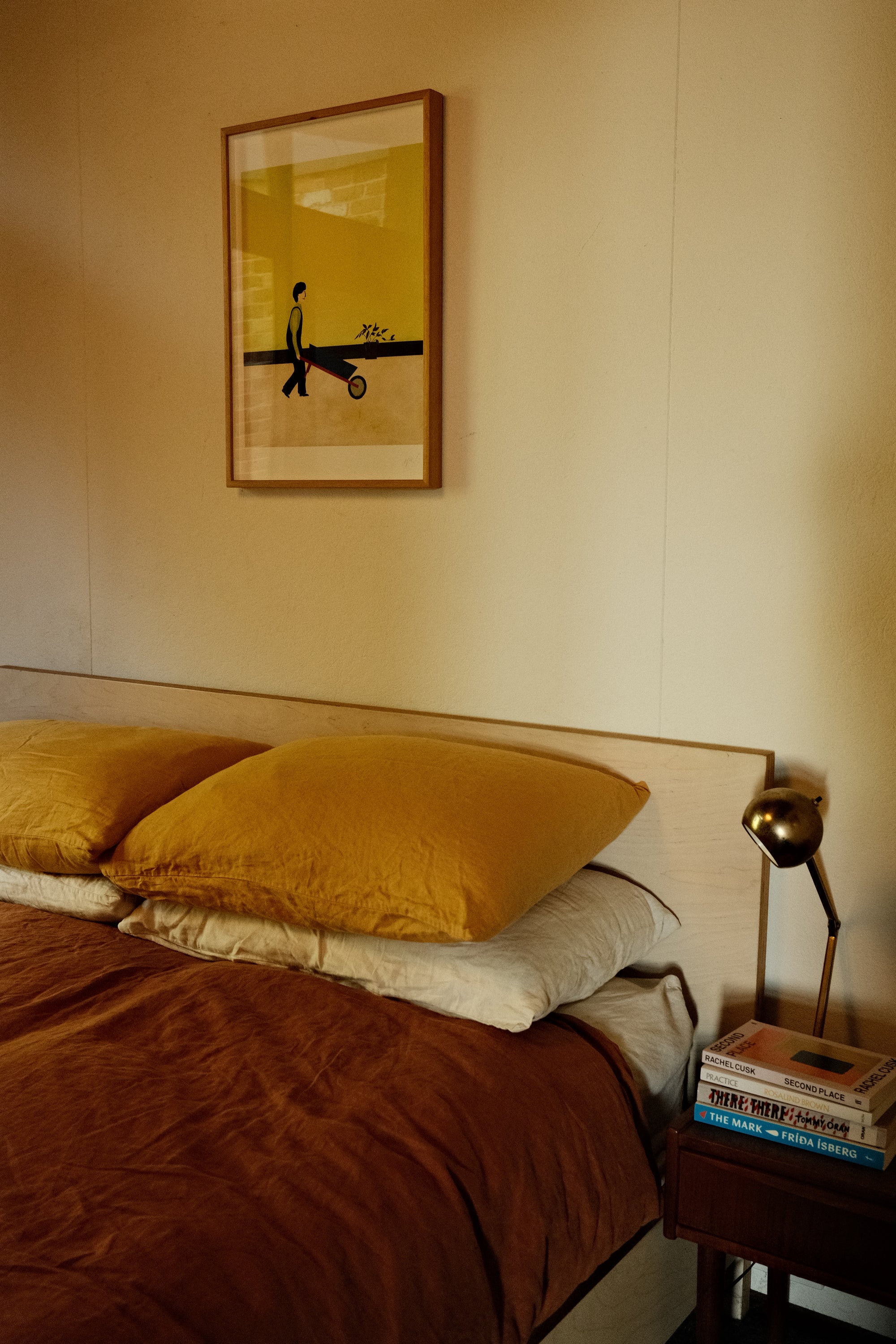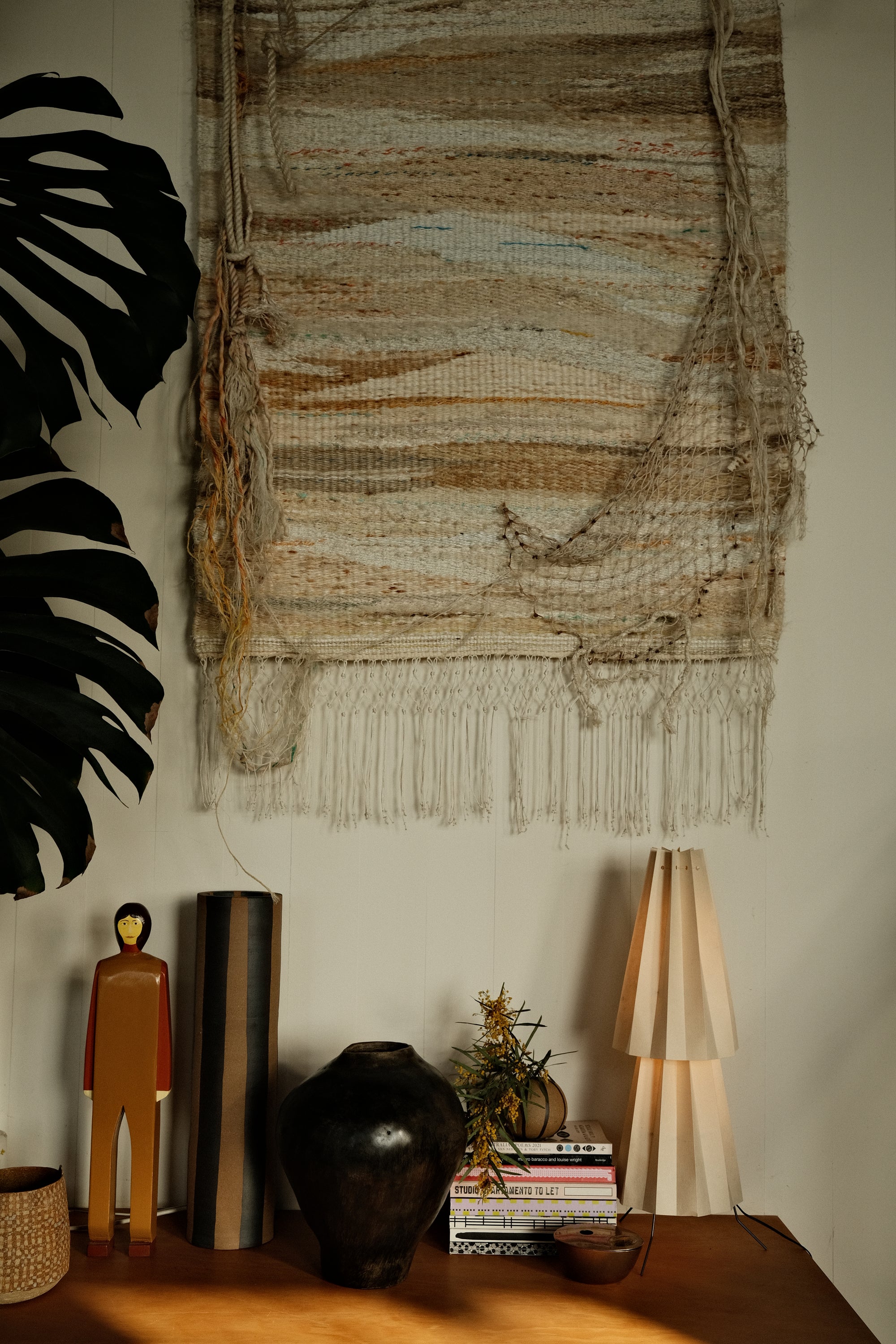 We have a few pieces by New Zealand artist Mark Alsweiler. I love his use of colour and the way he creates little worlds through human forms and architecture. I think I’m often drawn to pieces that are quite graphic and playful like Gareth Owen’s painting ‘What Nelson Sees at the Pub’ and Kane Lehanneur’s ‘Flower Bed 46’. Many of my favourites were gifted to us by friends and family—an incredible weaving by WA artist Hanne Ibach, who collects the rope from her walks along the coast. A beautiful Tiwi Island carved owl. A wonderful still life painting by my dear friend and artist Charlotte Swiden, and photographs by Cathy Marshall who used to work with us.